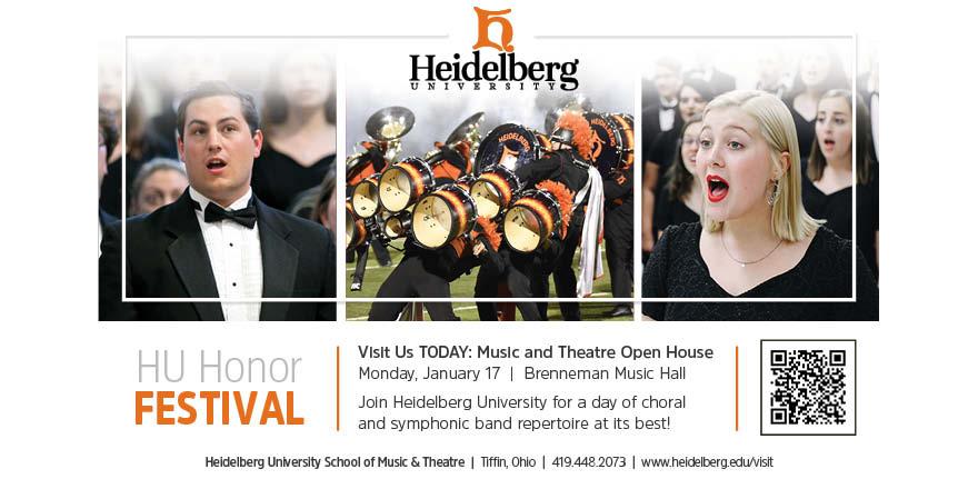 Join Heidelberg’s School of Music and Theatre on Monday, January 17th for a full day of experiencing choral and symphonic band repertoire at its best! Raise your voice in song with Dr. Greg Ramsdell and members of the Concert Choir. Bring your instrument to participate with Professor Jon Waters and members of the Symphonic Band. In addition to honor festival rehearsals, students can participate in mock auditions, masterclass with School of Music faculty members, and HU student panels about pursuing music as a major or passion in college. The Heidelberg University Honor Festival is open to all students interested in attending Heidelberg University, as well as by nomination of their band or choir director. Interested students should inquire through their music educators to participate in this event.