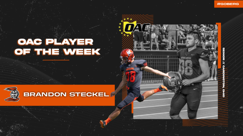 The Heidelberg University football team's Branden Steckel earned the OAC Player of the Week. After tying the OAC record for field goals made in a game, he helped vault the Student Princes to victory over Marietta on Saturday.