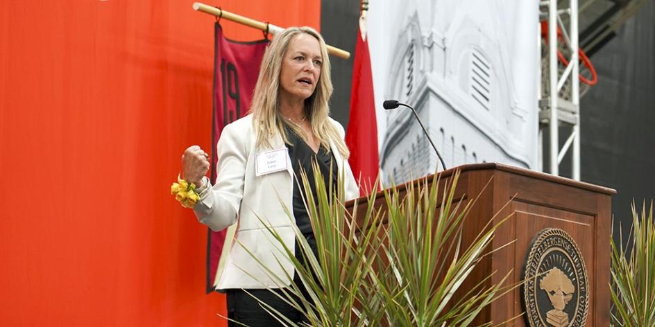 Earlier this year, we lost Patricia Adams, a strong champion for Heidelberg students and the namesake of PALS. Her memory was heavy on the hearts of our community as Susan McCafferty offered her welcome. “Pat was fun to work with,” Susan shared. “She was very welcoming.” Over 14 years ago, Pat, along with her husband, John ’58 and Trustee Emeritus, decided to create a lecture series focused on women’s leadership and empowerment. On our first PALS night after Pat’s passing, Jenny spoke to that vision stronger than ever. “Jenny Levy demonstrated leadership and empowerment in a world where she was often outnumbered,” Susan said as her welcome came to a close.