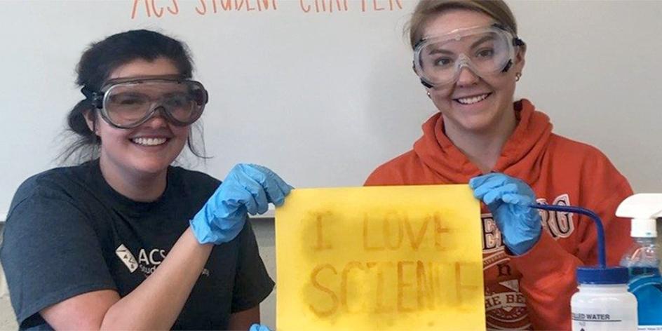 Courtney Temple and Lauren Mussig, both ’23, and current seniors Kirsten Kracht, Crimson Stuckert and Alyssa Derr created a chemical demo video targeted toward kids ages 8-12, as requested by the American Chemical Society.